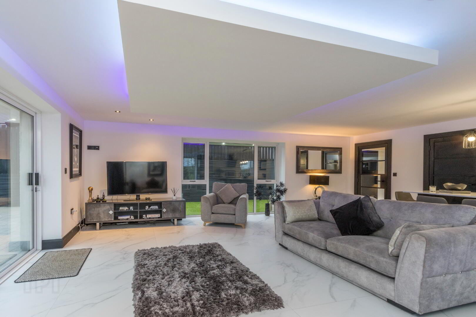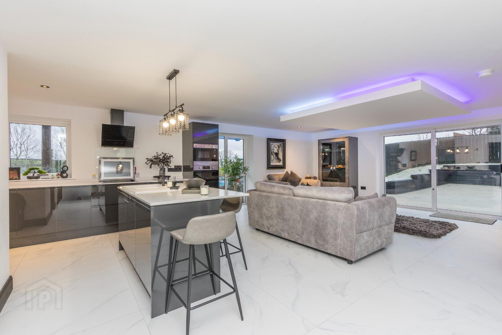 Lounge and Kitchen Area: (30'8 x 20'10) Generous open plan living and kitchen area, modern fitted kitchen with integrated appliances, feature island with sink and drainer, tiled flooring, mood lighting, patio doors to enclosed and private patio area.