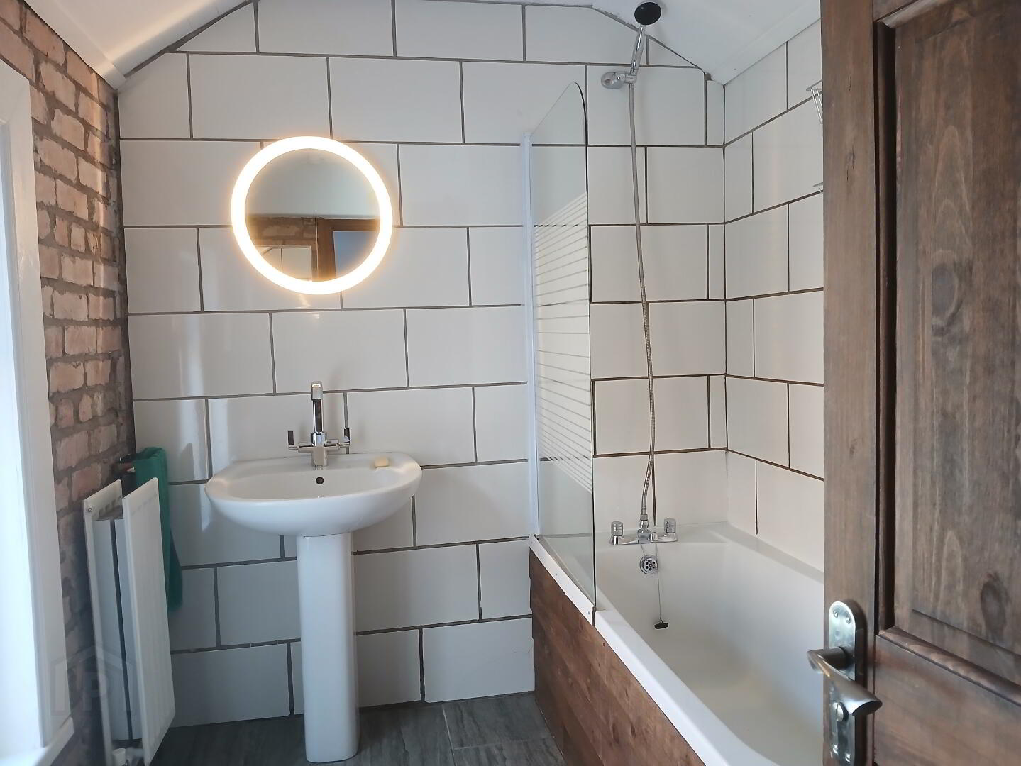 - A clean, bright bathroom suite featuring a bath with an overhead shower, perfect for both quick mornings and relaxing evenings.